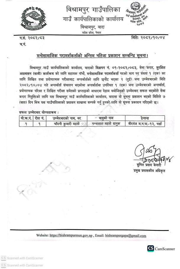 मनोसामाजिक परामर्शकर्ताको अन्तिम नतिजा प्रकाशन सम्बन्धी सूचना