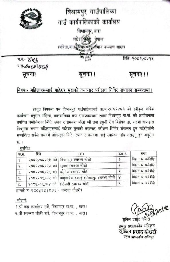महिलाहरुलाई पाठेघर मुखको क्यान्सर परीक्षण शिविर संचालन सम्बन्धमा ।।।