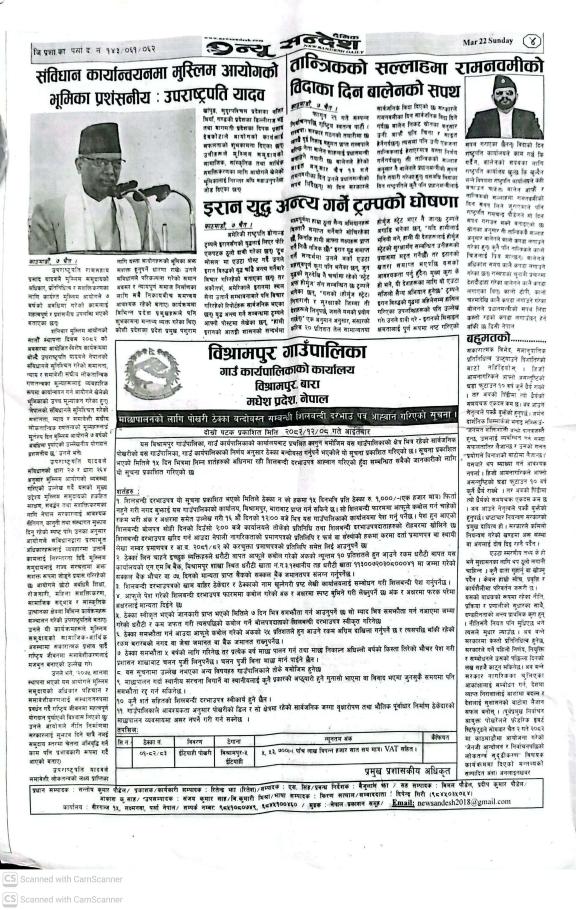 यस बिश्रामपुर गाउँपालिकाको आ.व. २०७९।०८० को स्वीकृत टावरलाईट जडान कार्य गर्नको लागि मिति २०८०।०१।२७ गते नागरिक दैनिक पत्रिकामा प्रकाशित विधुतीय बोलपत्रको सूचना ।