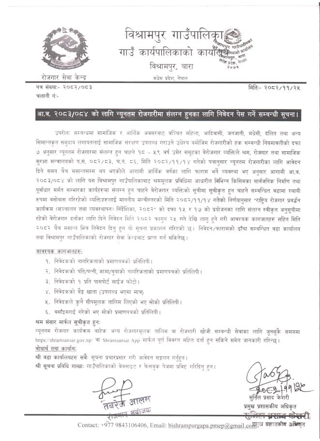 आ.व. २०८३/०८४ को लागि न्यूनतम रोजगारीमा संलग्न हुनका लागि निवेदन पेस गर्ने सम्बन्धी सूचना।