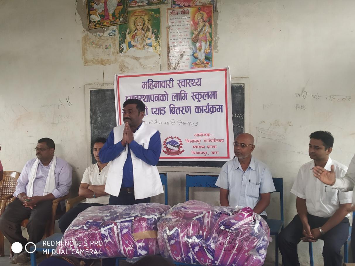 किशोर किशोरी कार्यक्रम अन्तर्गत महिनावारी ब्यवस्थापनको लागी बिश्रामपुर गा.पा.बाराको 3 वटा माध्यमिक विद्यालयमा स्यानेटरि प्याड बितरण कार्यक्रममा गा.पा प्रमुख श्री अमिरिलाल राउत पाल ज्यूको अध्यक्षतामा तथा प्र.प्र.अ.ज्यू को प्रमुख आथित्यतामा सम्पन्न भएको कार्यक्रमको तस्वीरहरु र यो कार्यक्रमको लागी सहयोग गर्नु हुने सबैलाई स-धन्यबाद बिश्रामपुर गा.पा.बारा